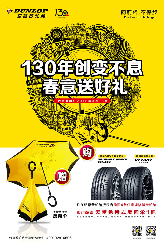 值此130周年慶典之際,為了回饋廣大車主對(duì)鄧祿普的厚愛與支持,鄧祿普將在全國范圍內(nèi)推出“春意送好禮”促銷活動(dòng):2018年3月至5月,消費(fèi)者前往鄧祿普指定門店購買4條SP SPORT MAXX 050+或VEURO VE303輪胎,即可獲贈(zèng)印有紀(jì)念LOGO的定制版天堂免持式反向傘,無論風(fēng)雨,鄧祿普都將與車主一路相伴。